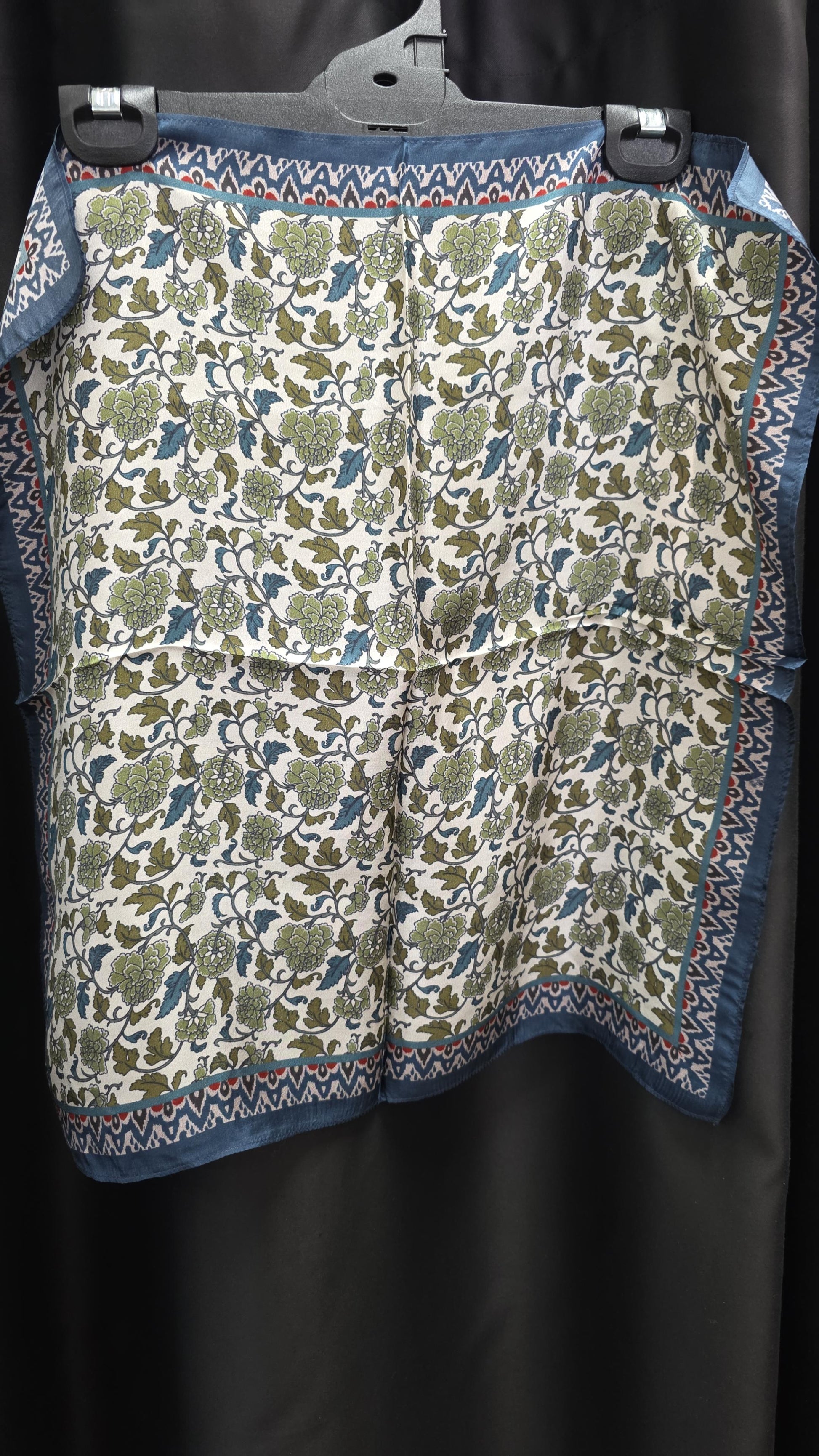The Classic Scarf / SKOCLAX50 by Directions International is a timeless accessory crafted from luxurious 100% silk. Featuring an elegant floral motif with winding vines and soft botanical detailing, this scarf is beautifully framed by a contrasting geometric border for a refined, polished finish. The harmonious blend of soft cream, blue, green, and subtle accent tones creates a versatile palette that complements both casual and sophisticated looks. Lightweight with a smooth, fluid drape, this silk scarf can be styled around the neck, worn as a shawl, or tied as a chic accent to elevate any outfit year-round.