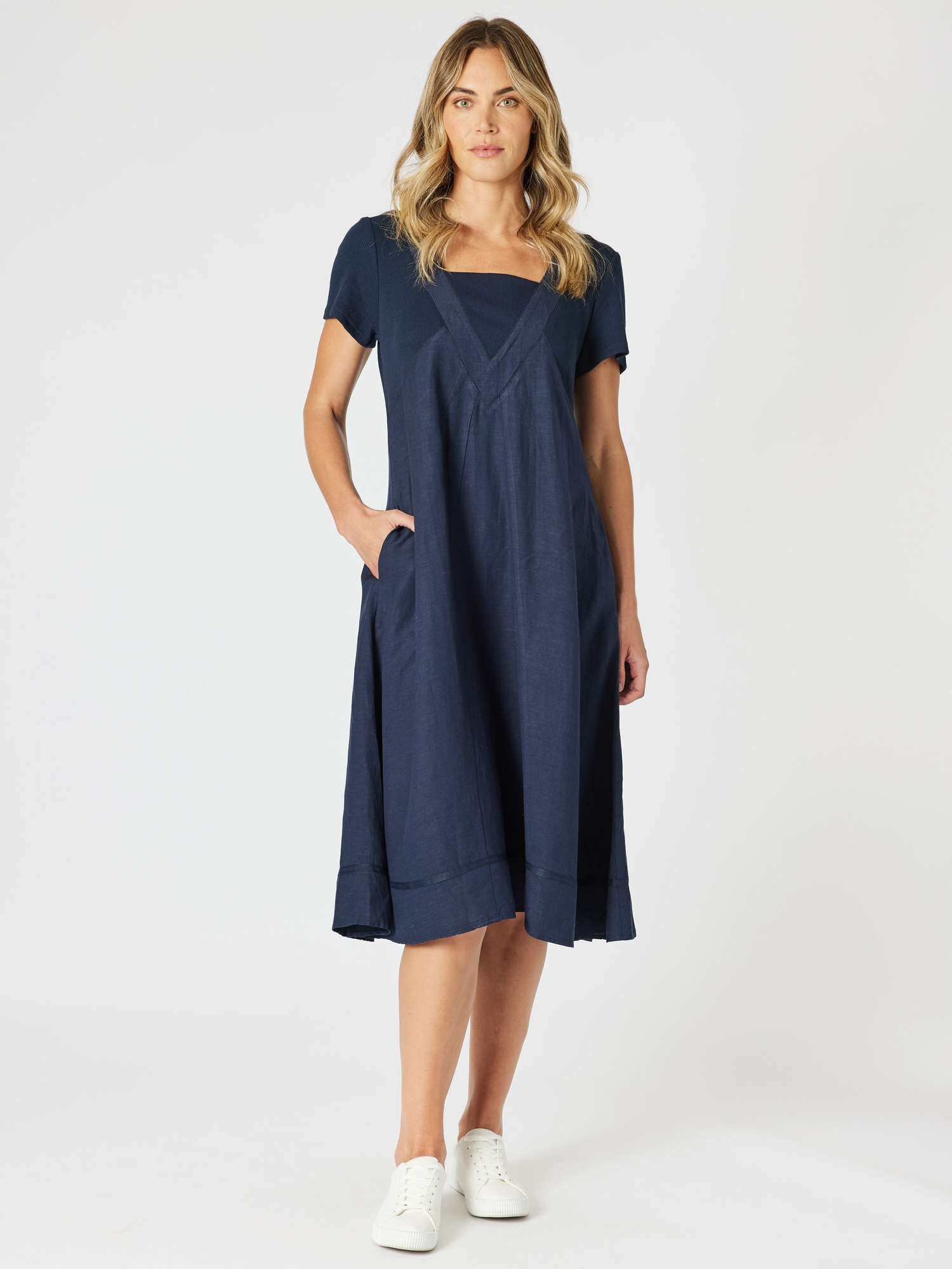 - Crafted from a soft linen-blend, this midi-length dress features a square neckline layered under a wide V-panel, finished with stretch ribbing at the shoulders and back for added comfort and flexibility.