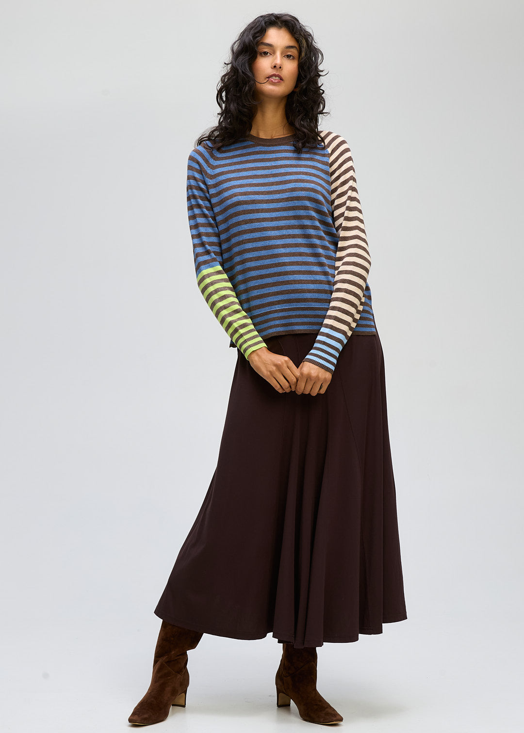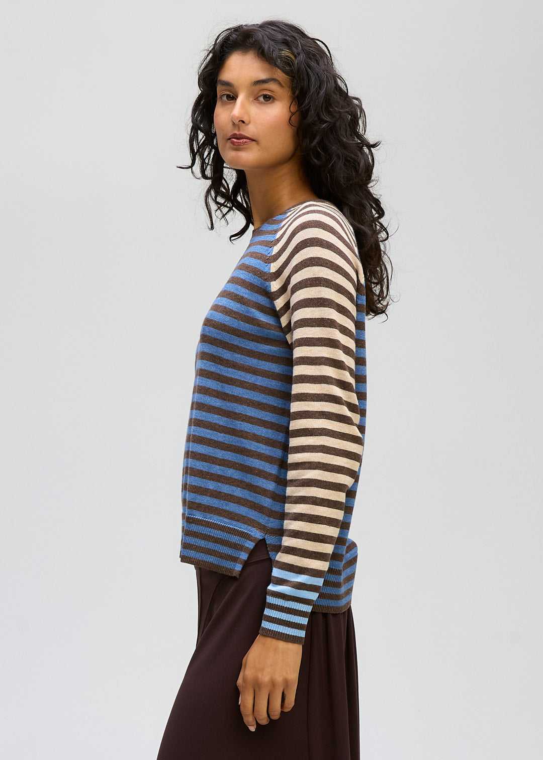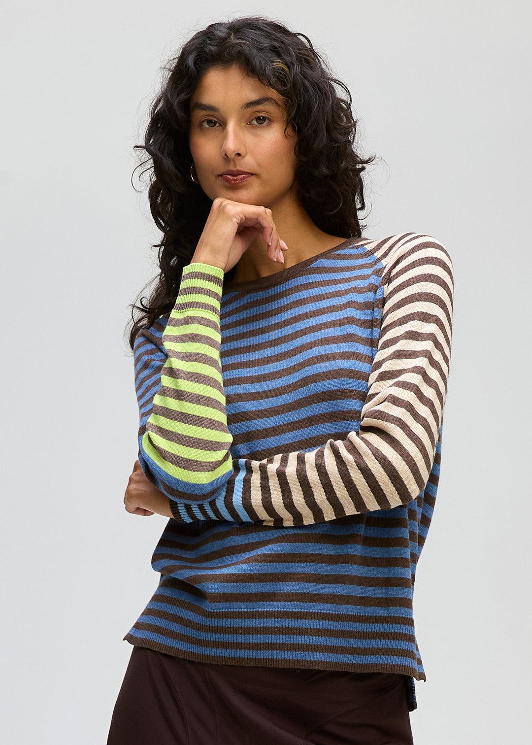 Crafted in a soft knit with a classic crew neckline, the mix of colours across the body and sleeves adds visual interest while remaining easy to wear. Finished with ribbed cuffs and hem, this piece offers a comfortable, flattering fit that works effortlessly from day to night.