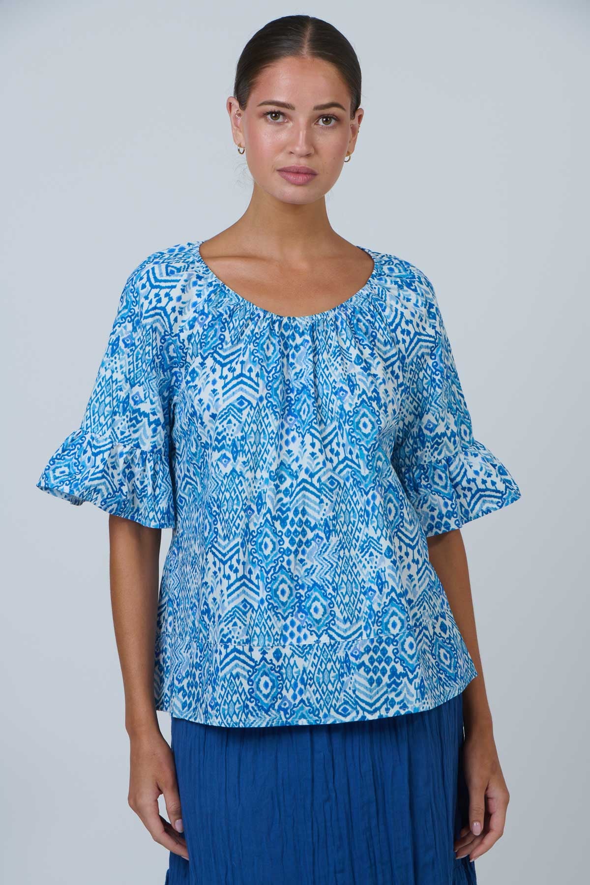 This NAM71 flowy top features a patterned print, a relaxed scoop gathered neckline that can be styled on or off the shoulder for versatile wear, and charming flutter sleeves for a feminine touch. The lightweight 100% cotton fabric and easy-fit silhouette make it perfect for pairing with shorts or white trousers for a polished summer look.