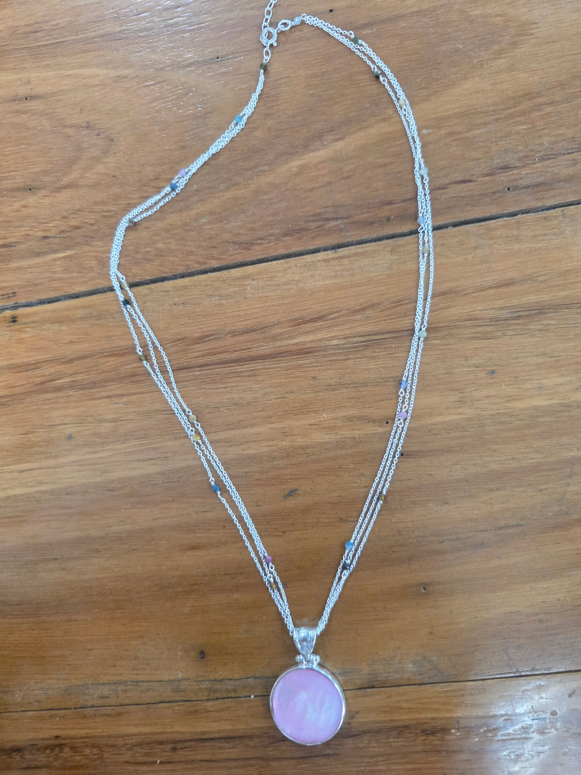 Mother of Pearl double sided 2cm round pendant necklace set in 3mm Sterling Silver. The pendant features a smooth, round piece of mother of pearl shell that displays an iridescent, white sheen plus reverse side is a man made pink MOP. The necklace has a distinctive triple-strand sterling silver chain with small, colourful precious stone interspersed throughout.