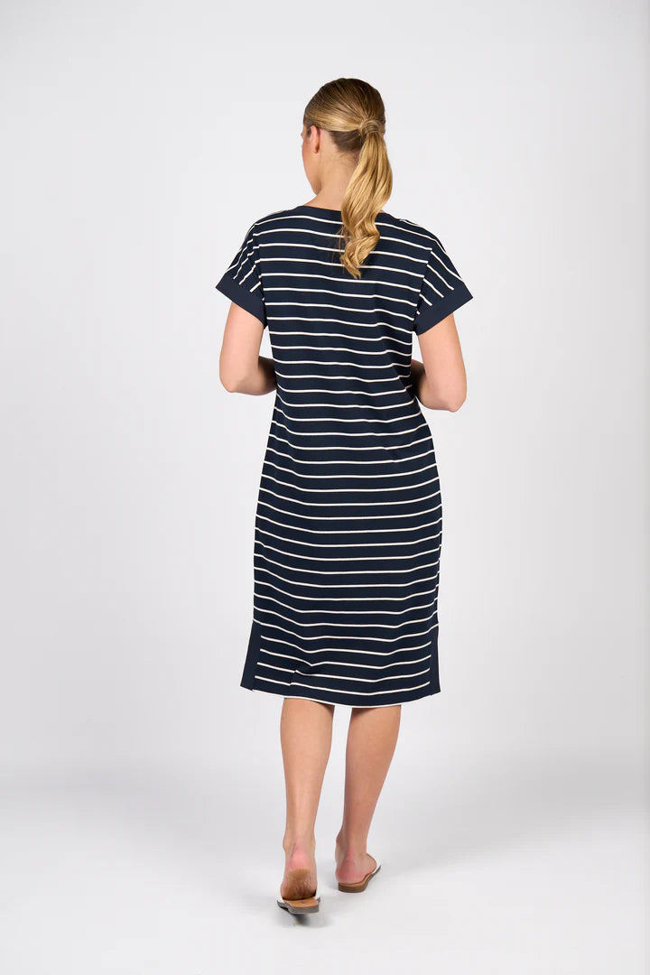 A relaxed striped t-shirt dress made from soft cotton-elastane blend, featuring a round neckline and short drop sleeves for an effortless fit. Finished with side splits at the hem for ease of movement and a laid-back look.